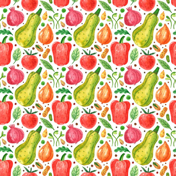 zucchini, bell pepper and onion patterns on white fabric D1054